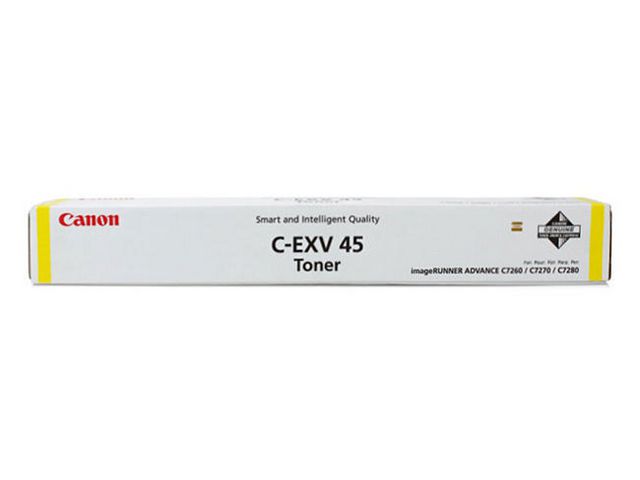 Produktbeskrivning:Välj tonern Canon 45 för att få prestanda och funktionalitet hemma eller på kontoret. Förbättra skrivarens prestanda och säkerställ högkvalitativa utskrifter med tonern Canon 45. Den här kassetten innehåller gul toner och har en kapacitet på 52 000 sidor med 5 % täckning. - Färg: Gul - Kapacitet på 52 000 sidor - Sidkapacitetstäckning: 5 % - Singelförpackning - Kompatibla med: IR ADVC7260i, C7270i, C7280i
